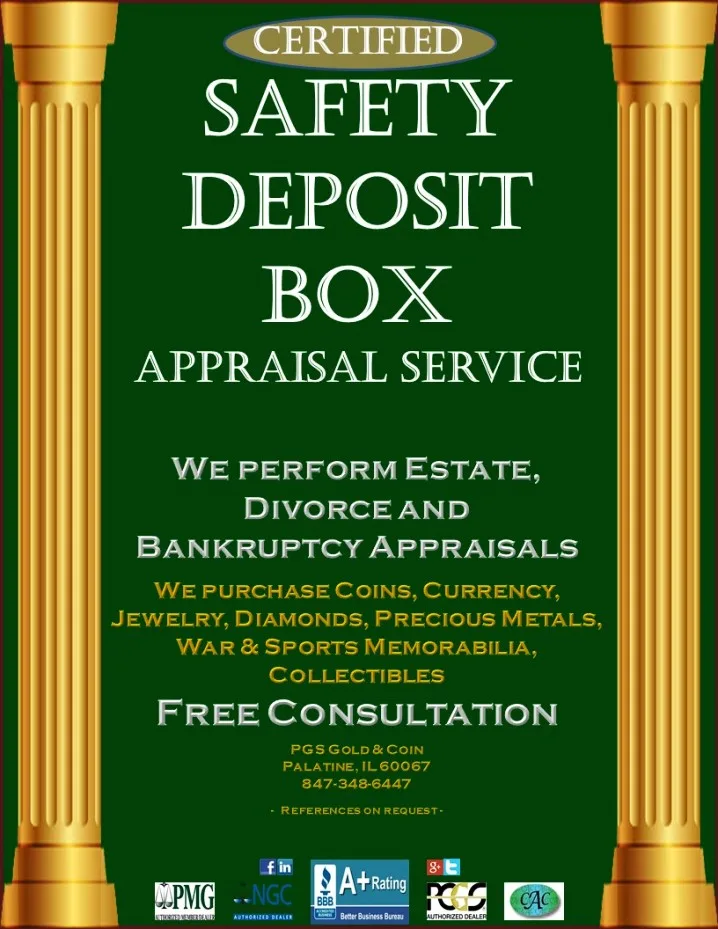 In addition to Safe Deposit Box Appraisals, PGS Gold & Coin provides certified appraisals for the purposes of Bankruptcy, Divorce, and Inheritance. Our professional & knowledgeable appraisers have over 30 years of experience providing trustworthy appraisal services.