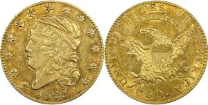 1822 $5 gold piece, EF45 (estimated grade) – $6,000,000. There were 17,796 $5 gold pieces struck in 1822, but only three survive today. Two are now in the Smithsonian Institution and this coin, the finest of the three, is now in a private collection. This coin was last sold in the October, 1982 auction of the Louis Eliasberg gold coin collection where it realized a then-record $687,500.