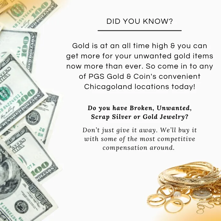 At PGS Gold & Coin, we have built a reputation as the most trusted jewelry buyer in the Chicago area because we routinely offer better appraisals than other jewelry buyers. Bring in your scrap gold, silver, or platinum! Whether it’s old jewelry you don’t wear anymore or mismatched earrings, and our professionals will weigh and evaluate it on the spot. Walk away with cash in hand for your items. Visit our PGS Gold & Coin stores in Wheaton, Palatine, or Schaumburg, IL, and get the most value for your gold today!